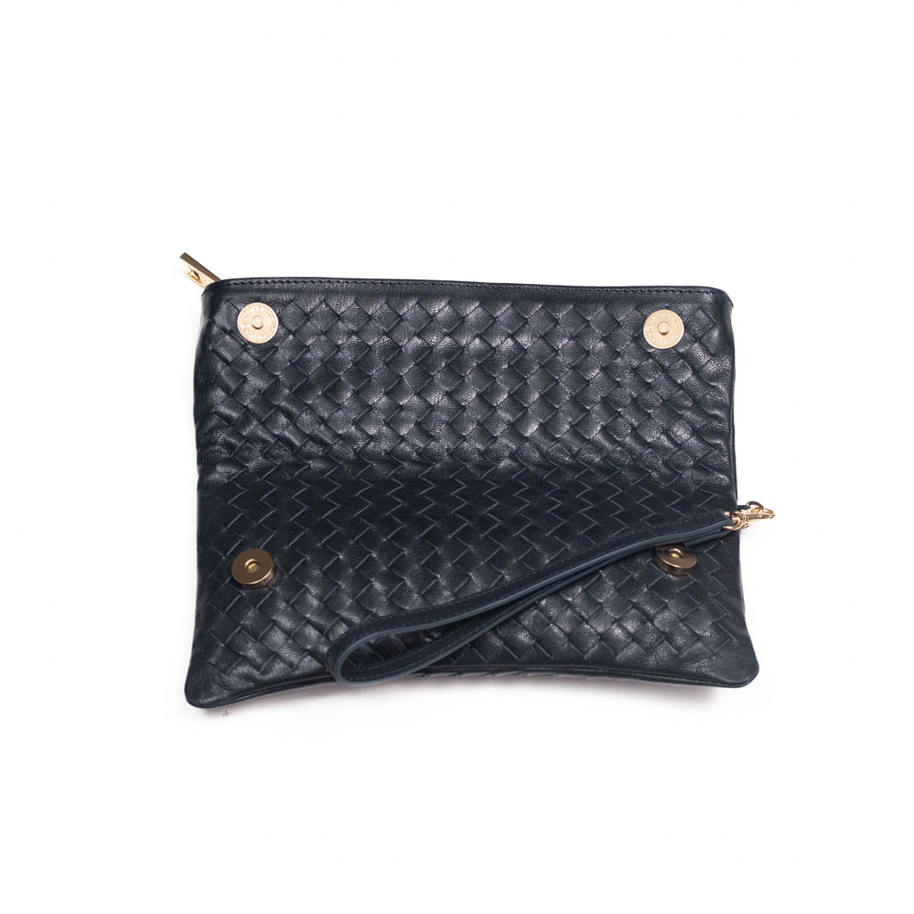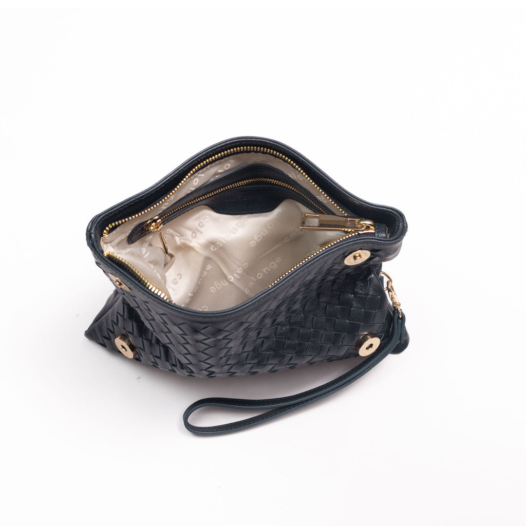 This foldover pouch is easy to carry, responding to today's need for effortless yet sophisticated accessories. It can be worn as a clutch or a wristlet