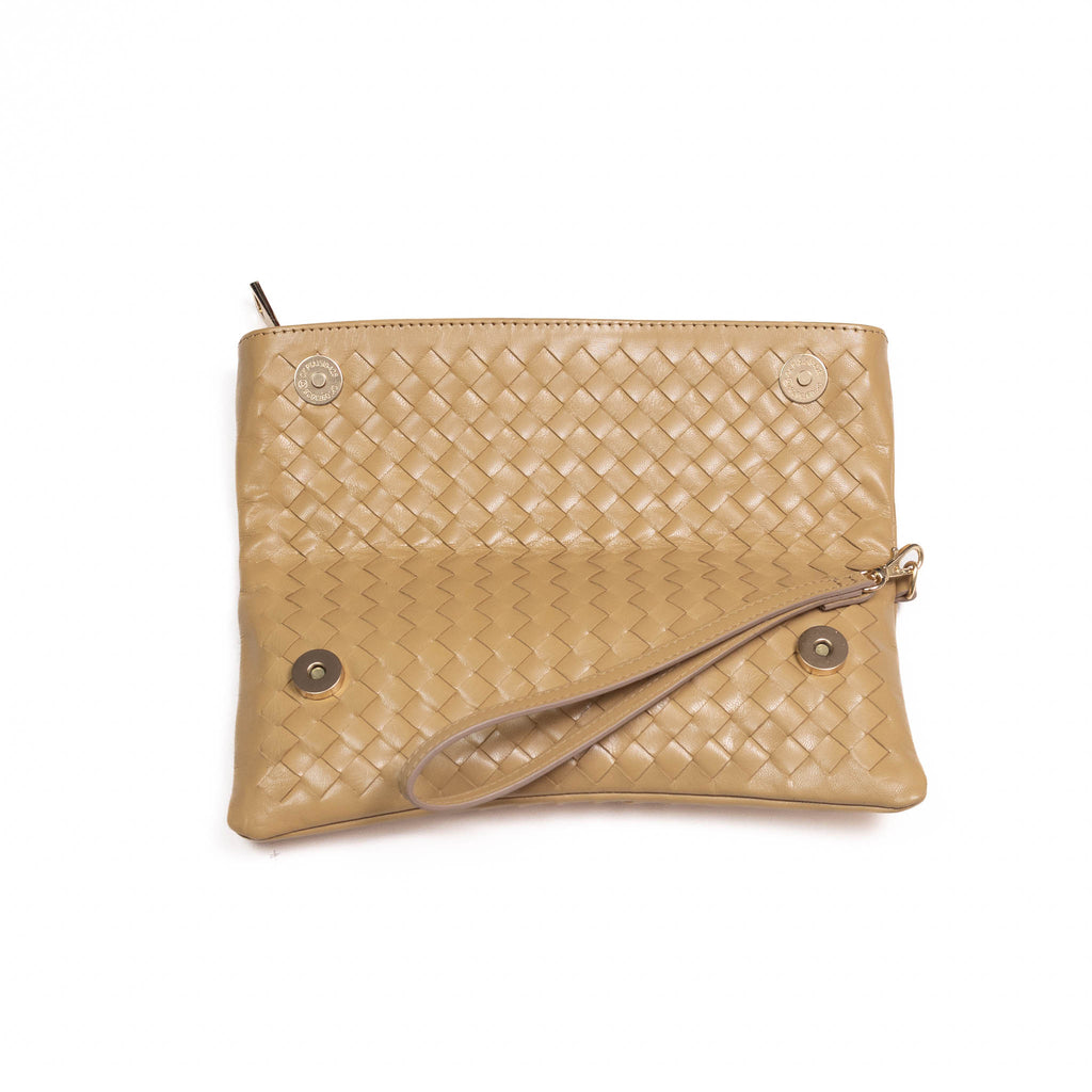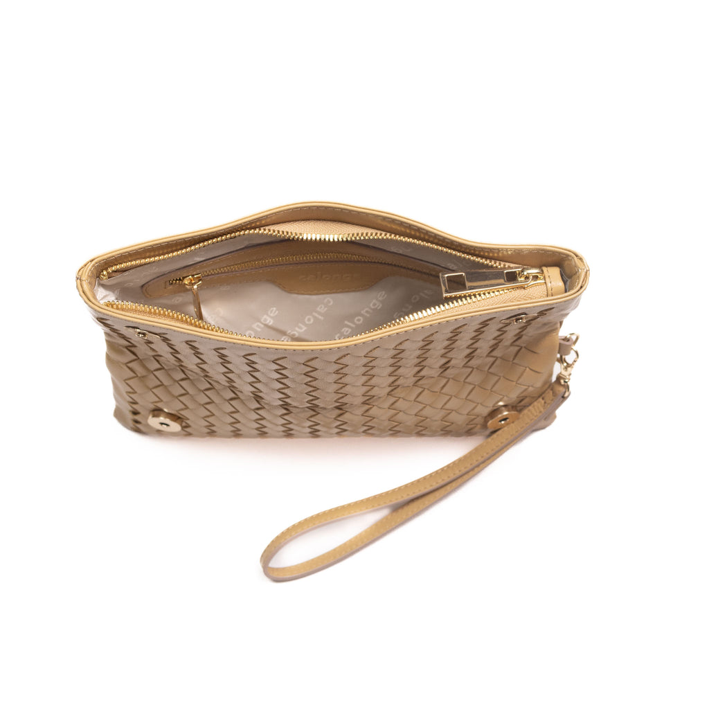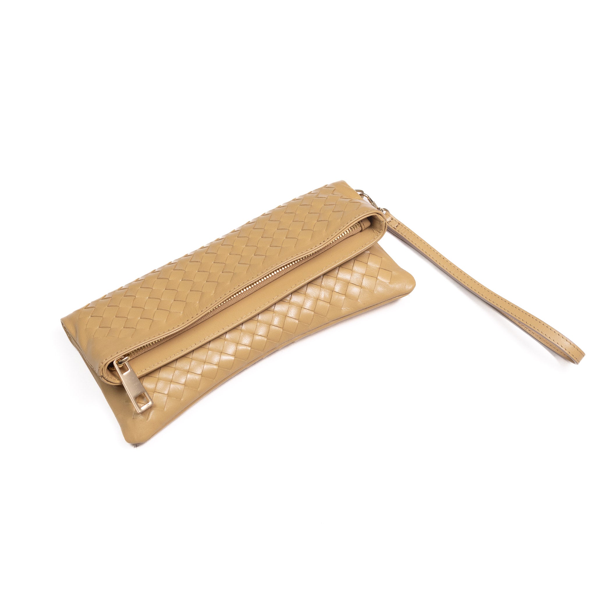 This foldover pouch is easy to carry, responding to today's need for effortless yet sophisticated accessories. It can be worn as a clutch or a wristlet