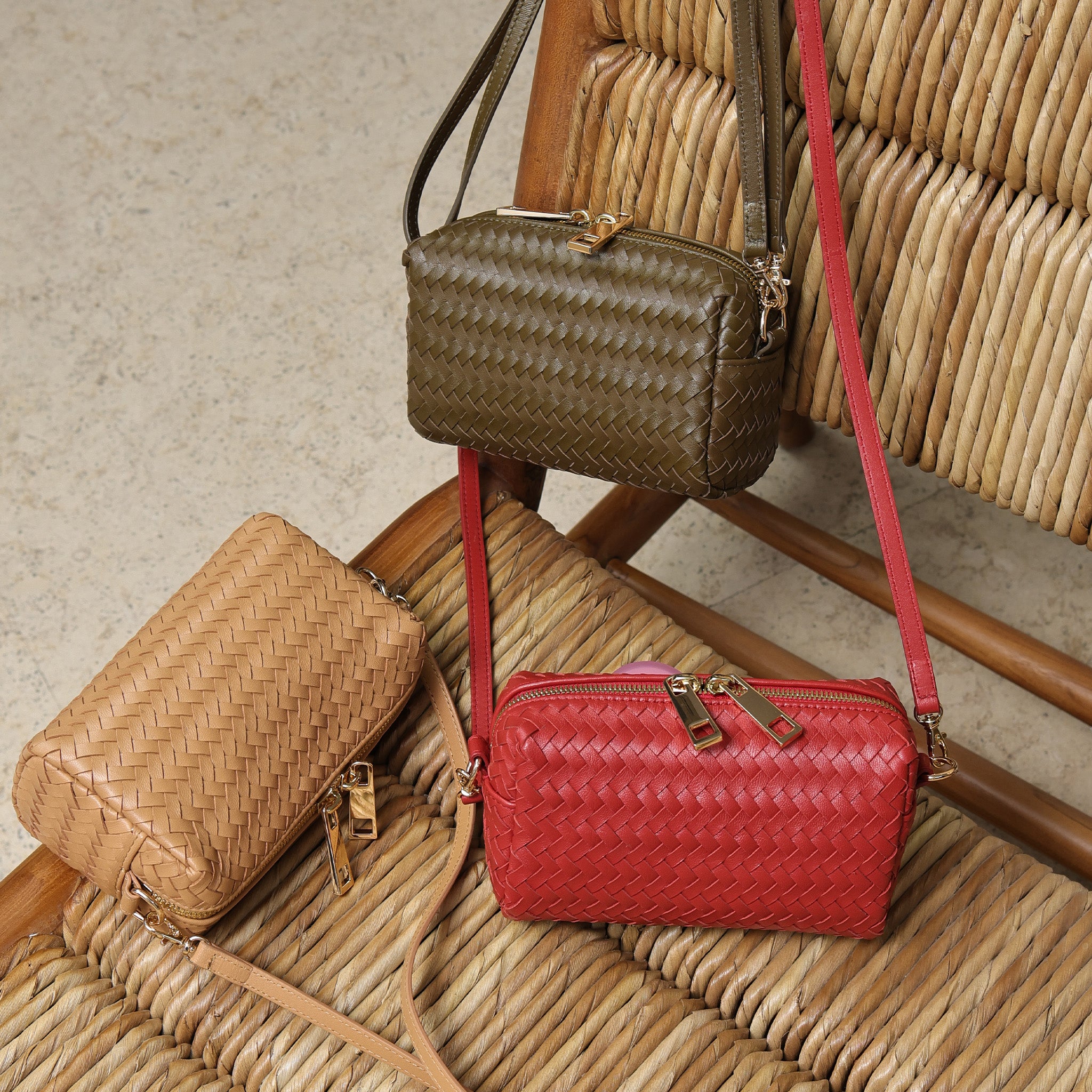 A compact and elegant woven leather bag crafted with a finely double jump design that adds rich texture and depth.