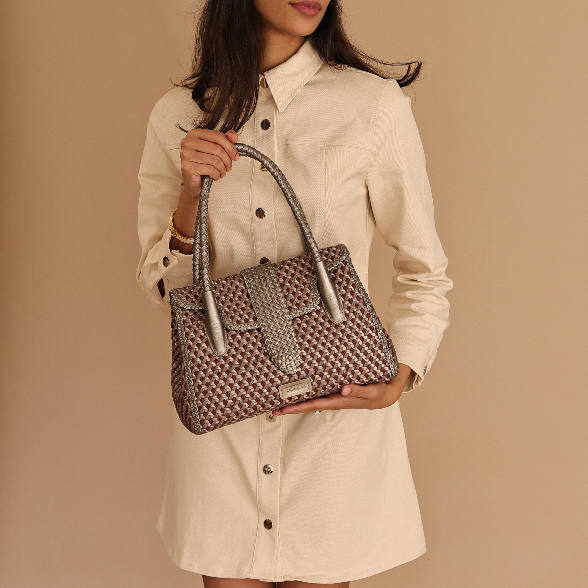 A sleek handwoven medium shoulder bag that is crafted from finely folded leather laces. Features a braided decorative strap on the front flap.