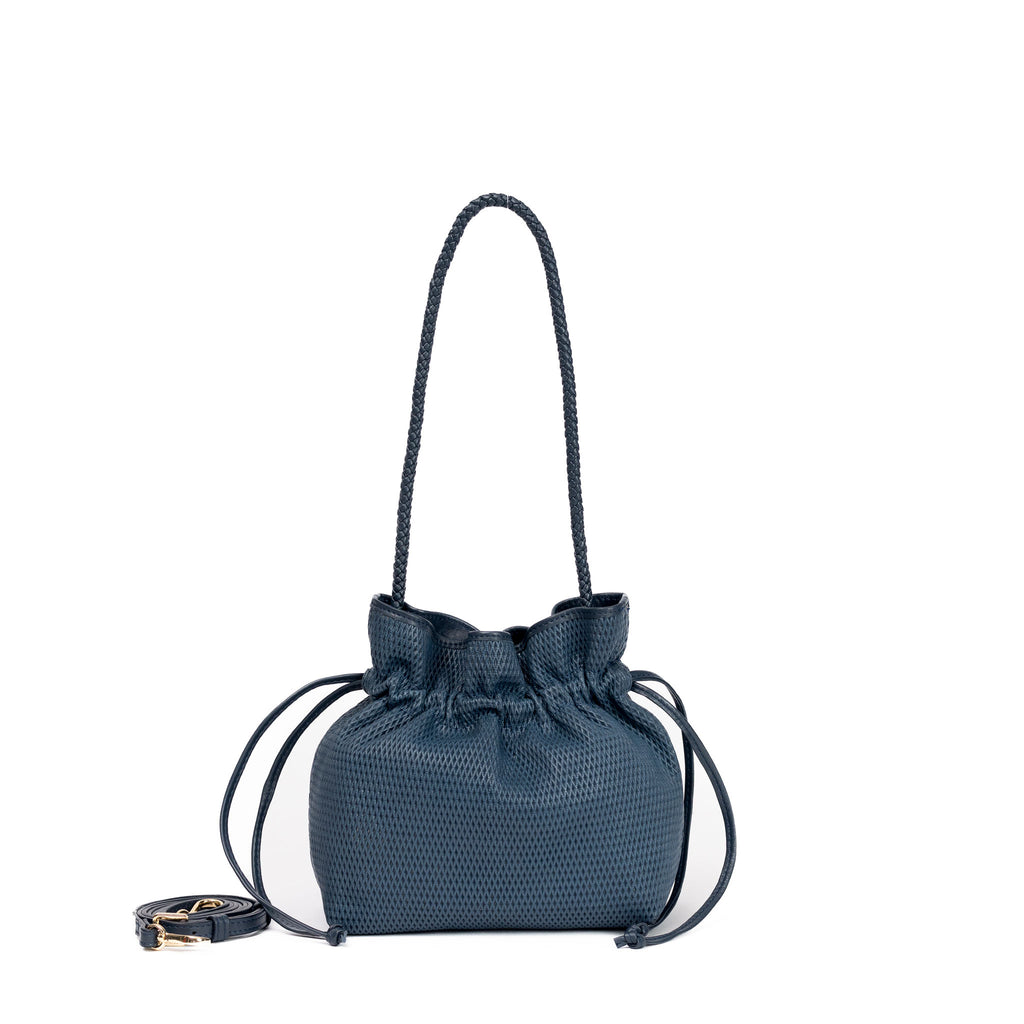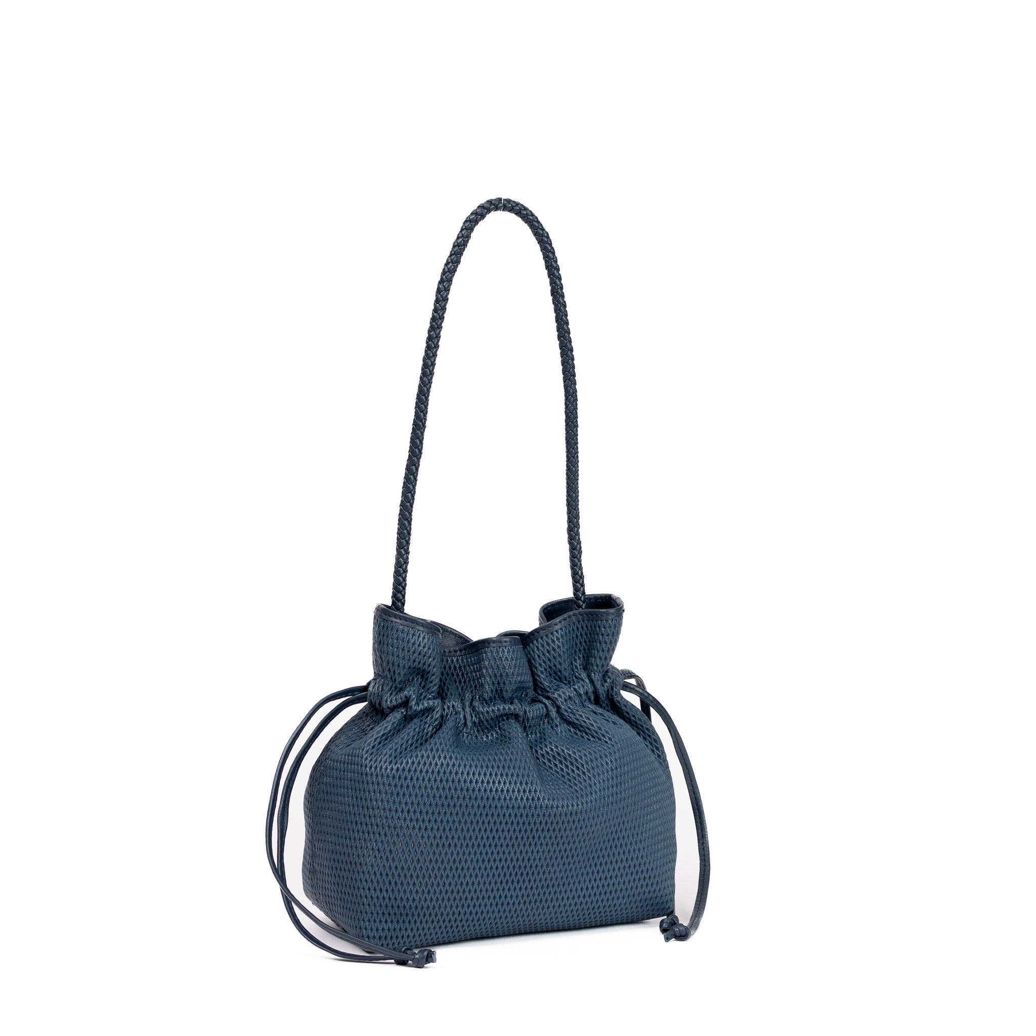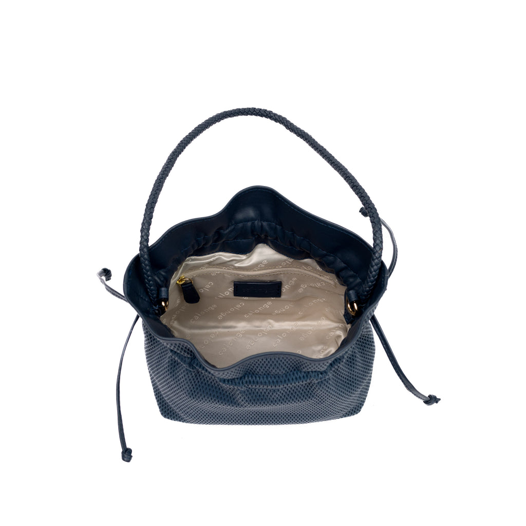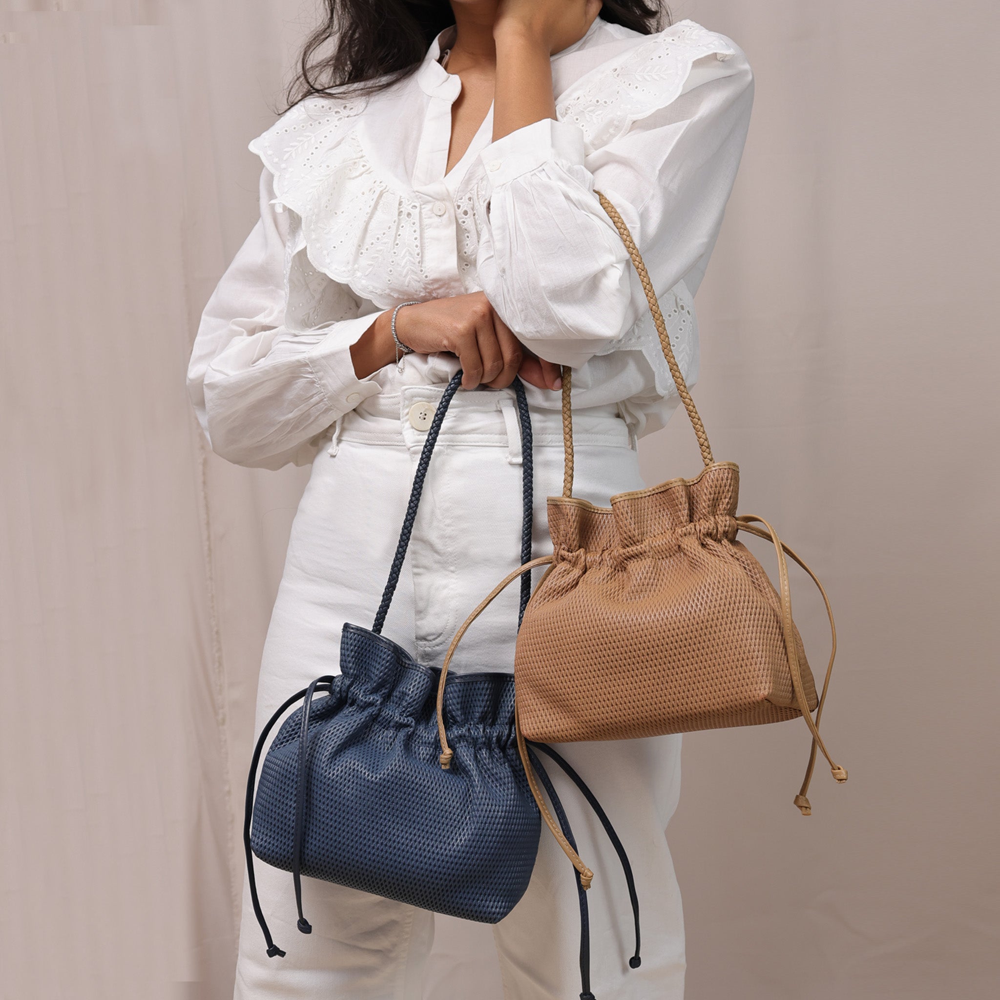 Drawstring closure with two leather cords that cinch at the sides for easy access and secure storage.