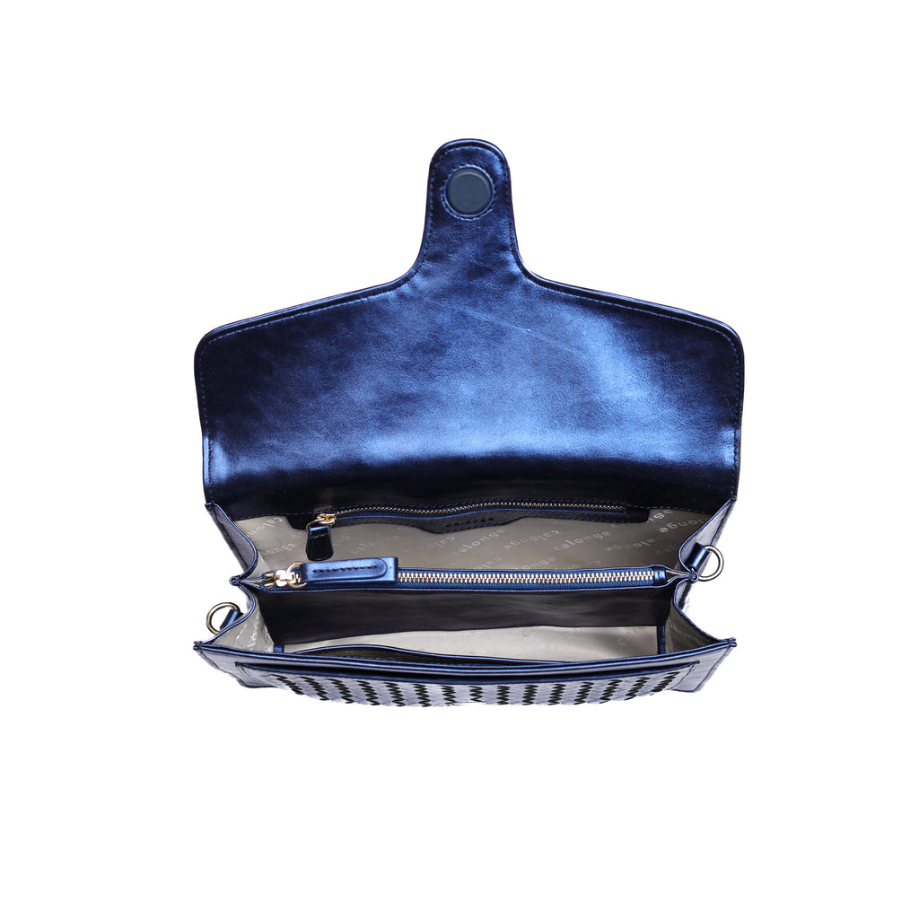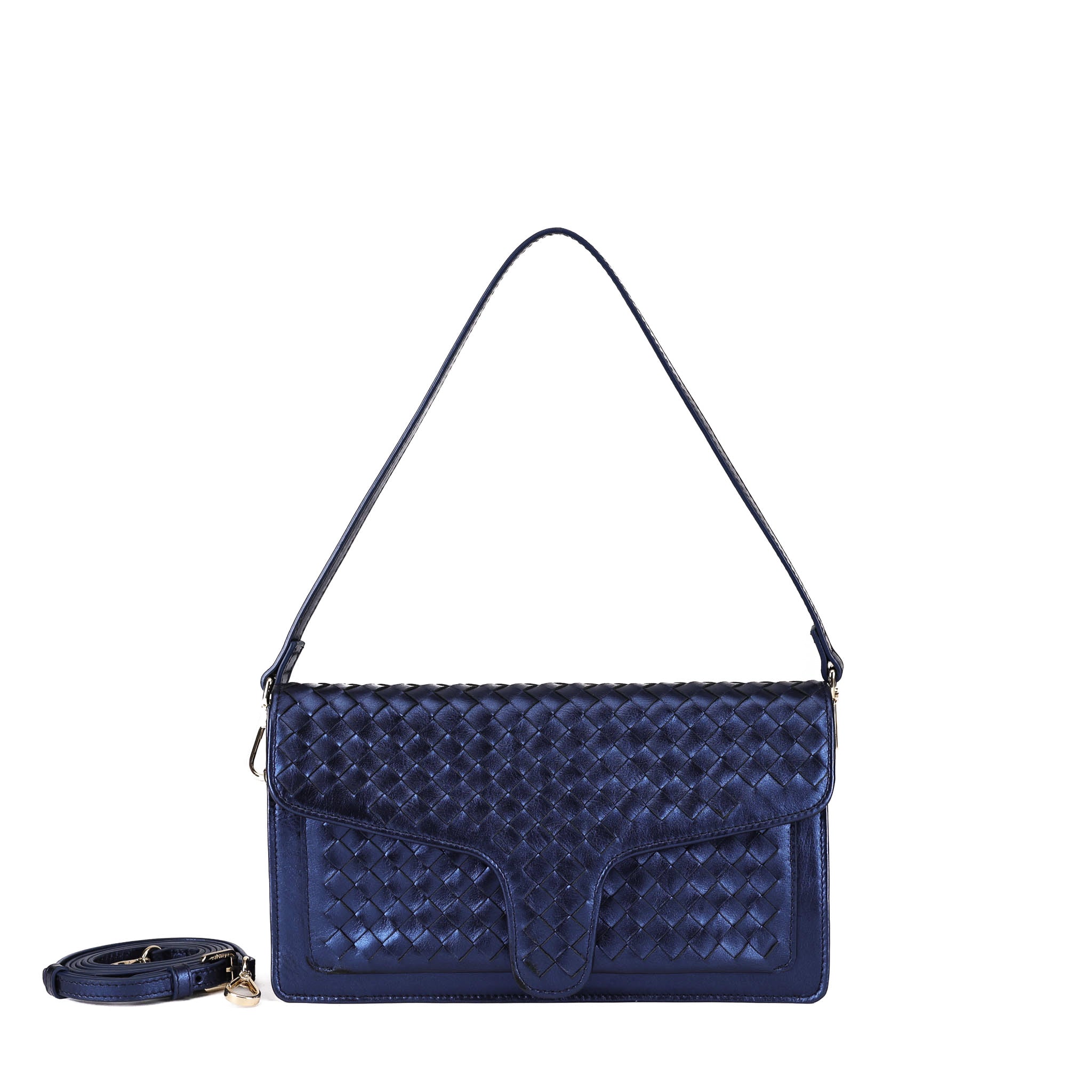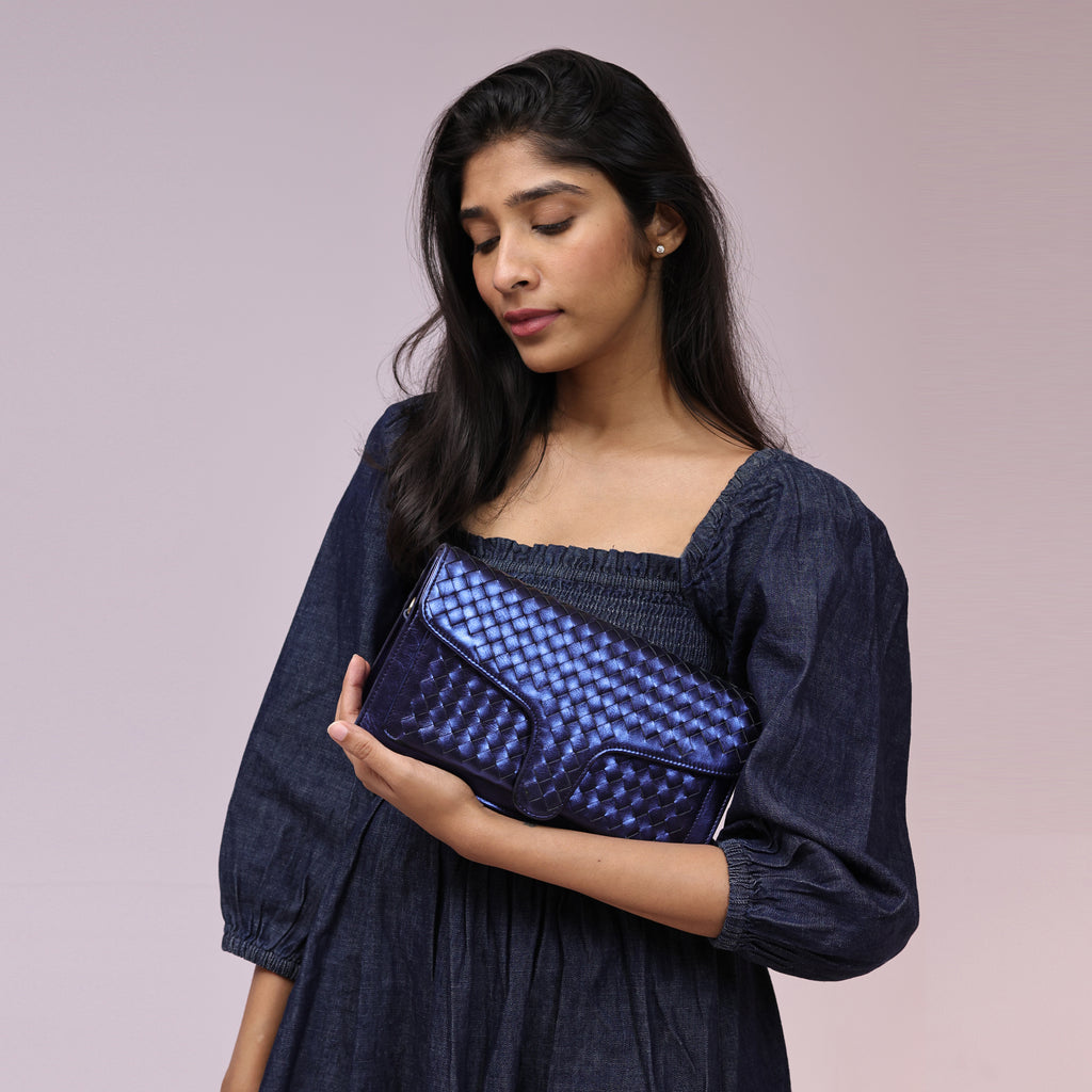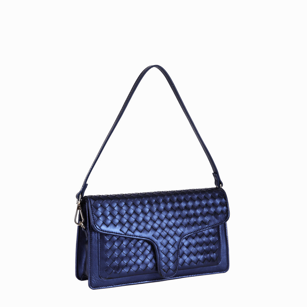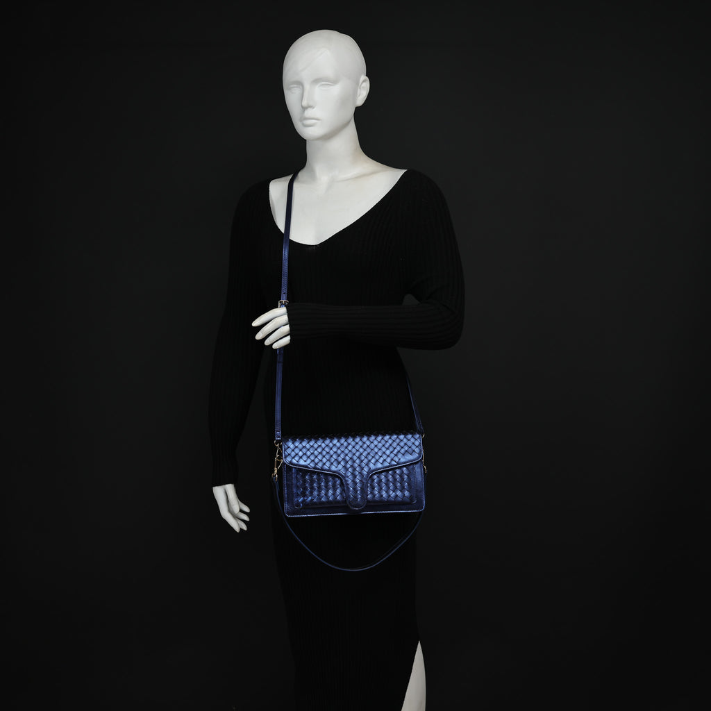 A sleek woven shoulder/crossbody bag.