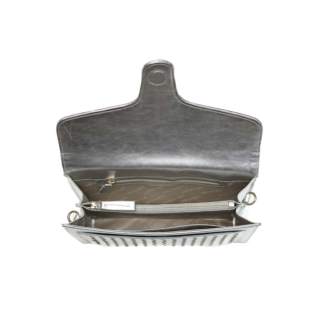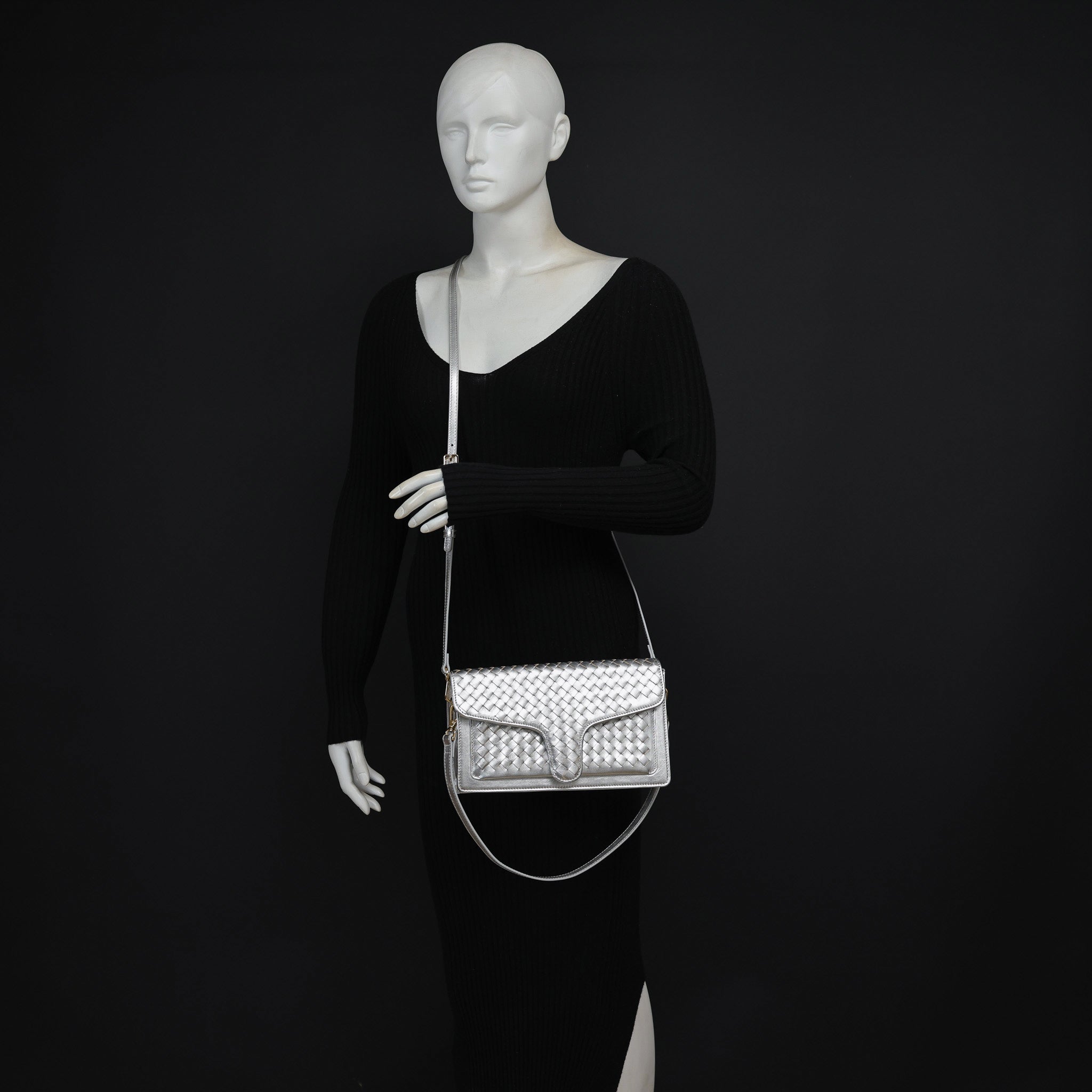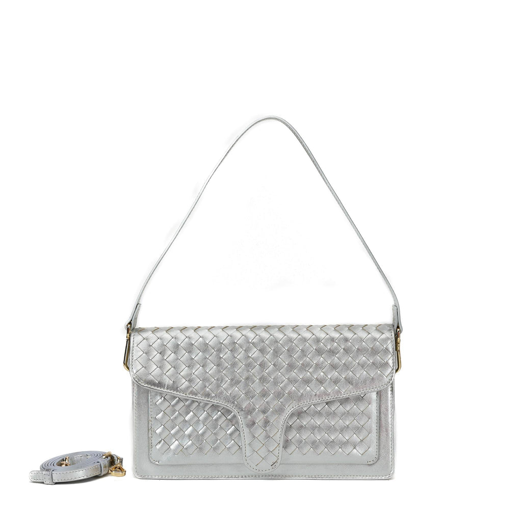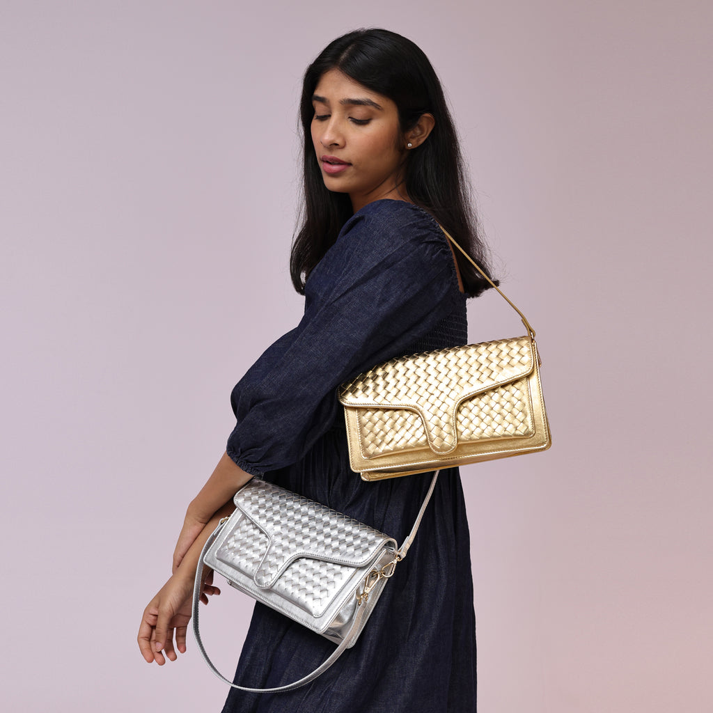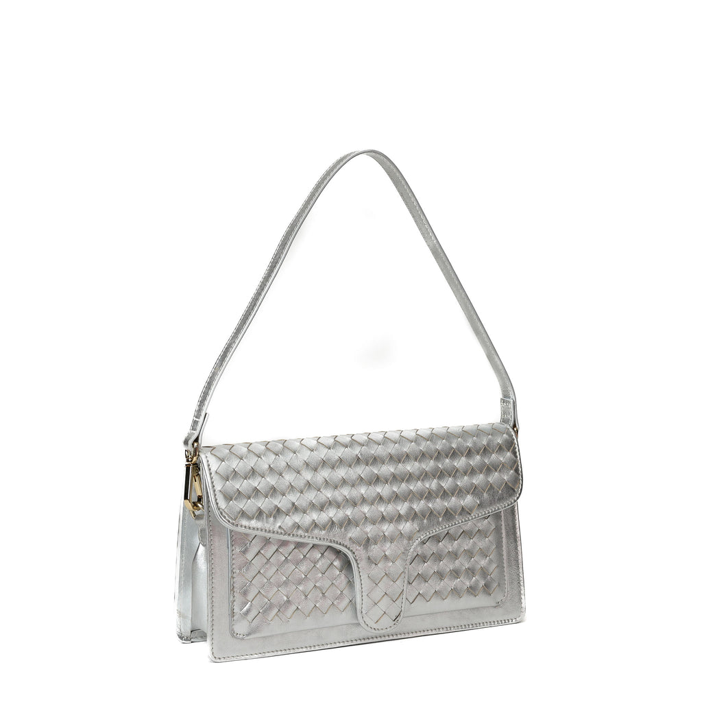 A sleek woven shoulder/crossbody bag.