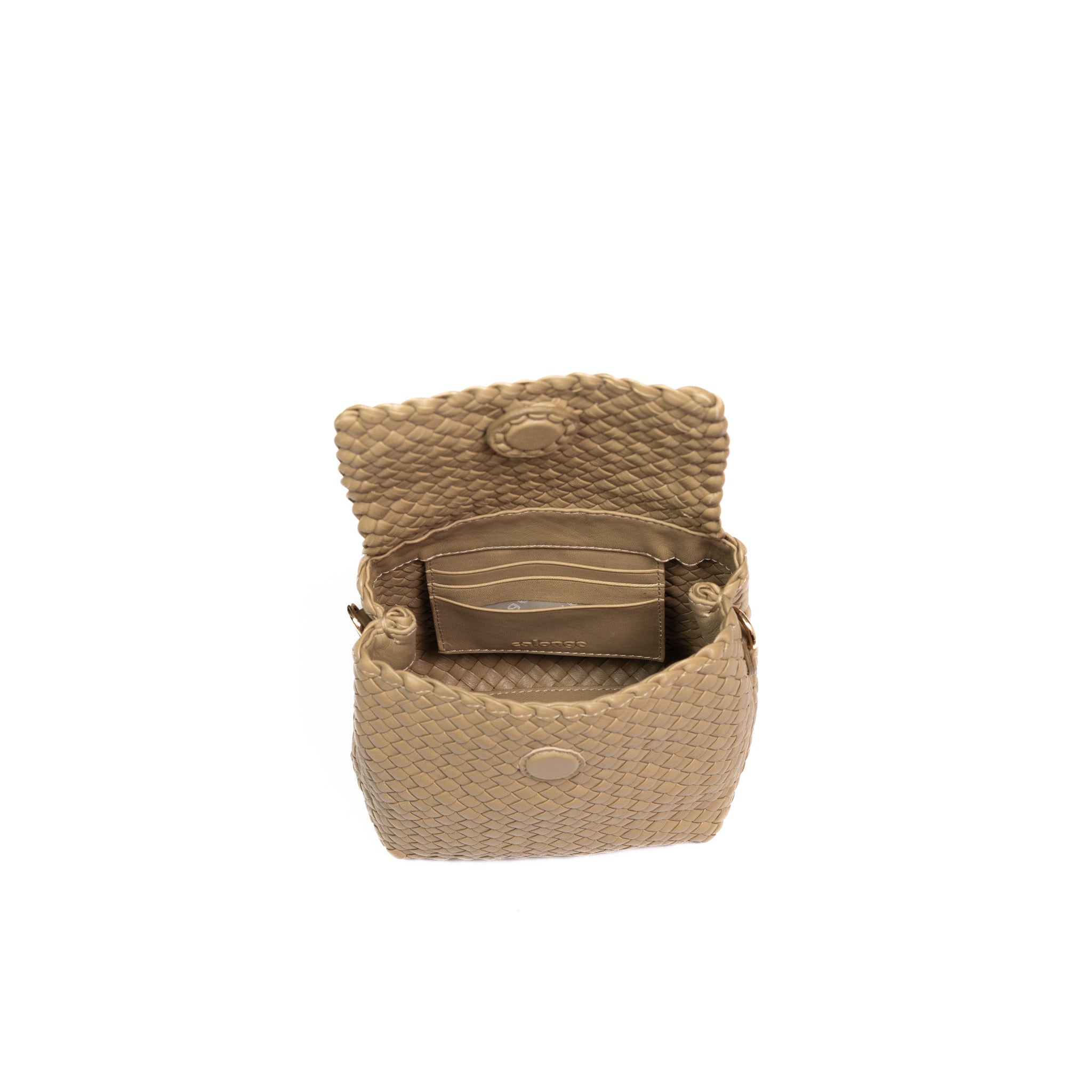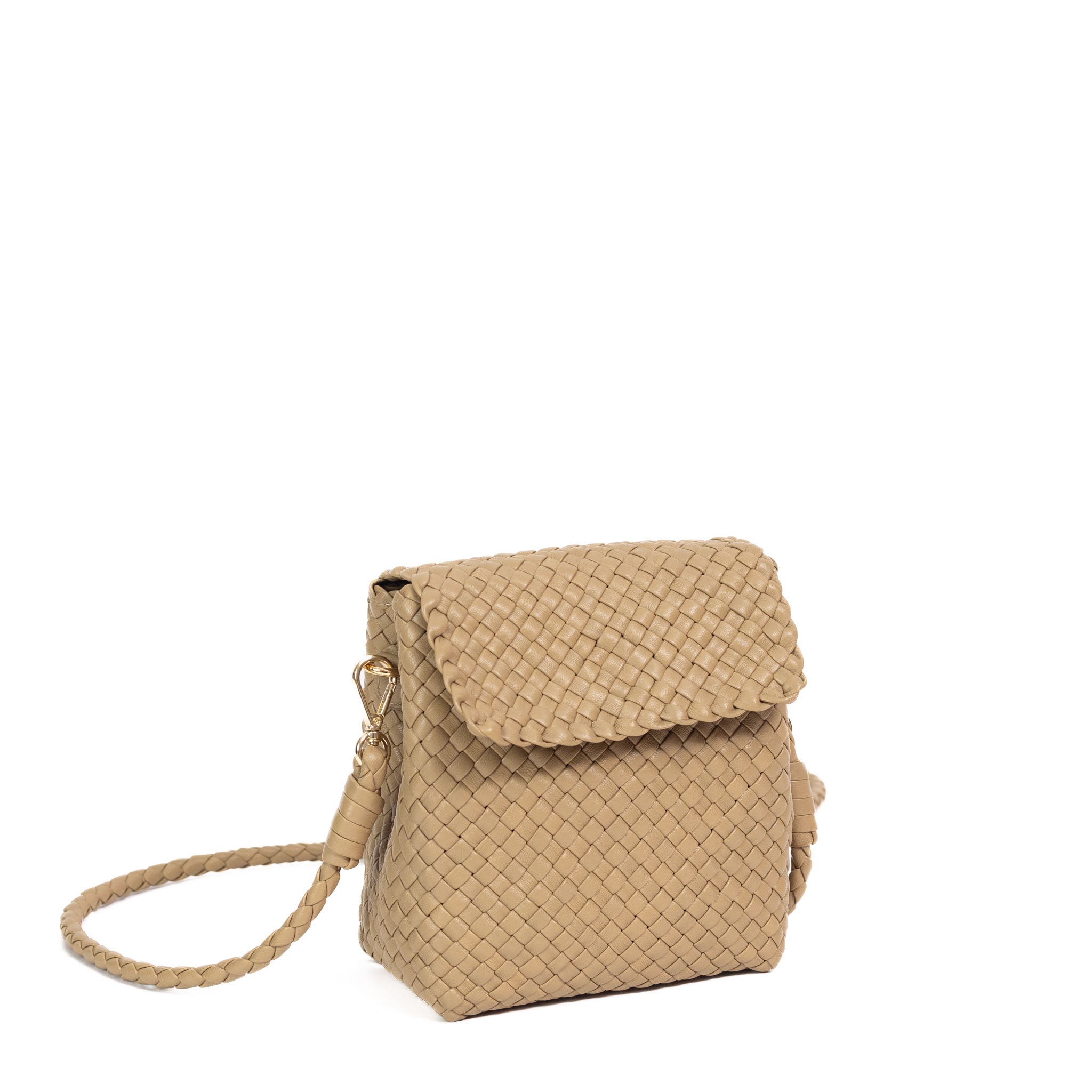 A beautifully handcrafted woven leather bag made with finely interlaced leather strips, showcasing skilled artisanal craftsmanship.