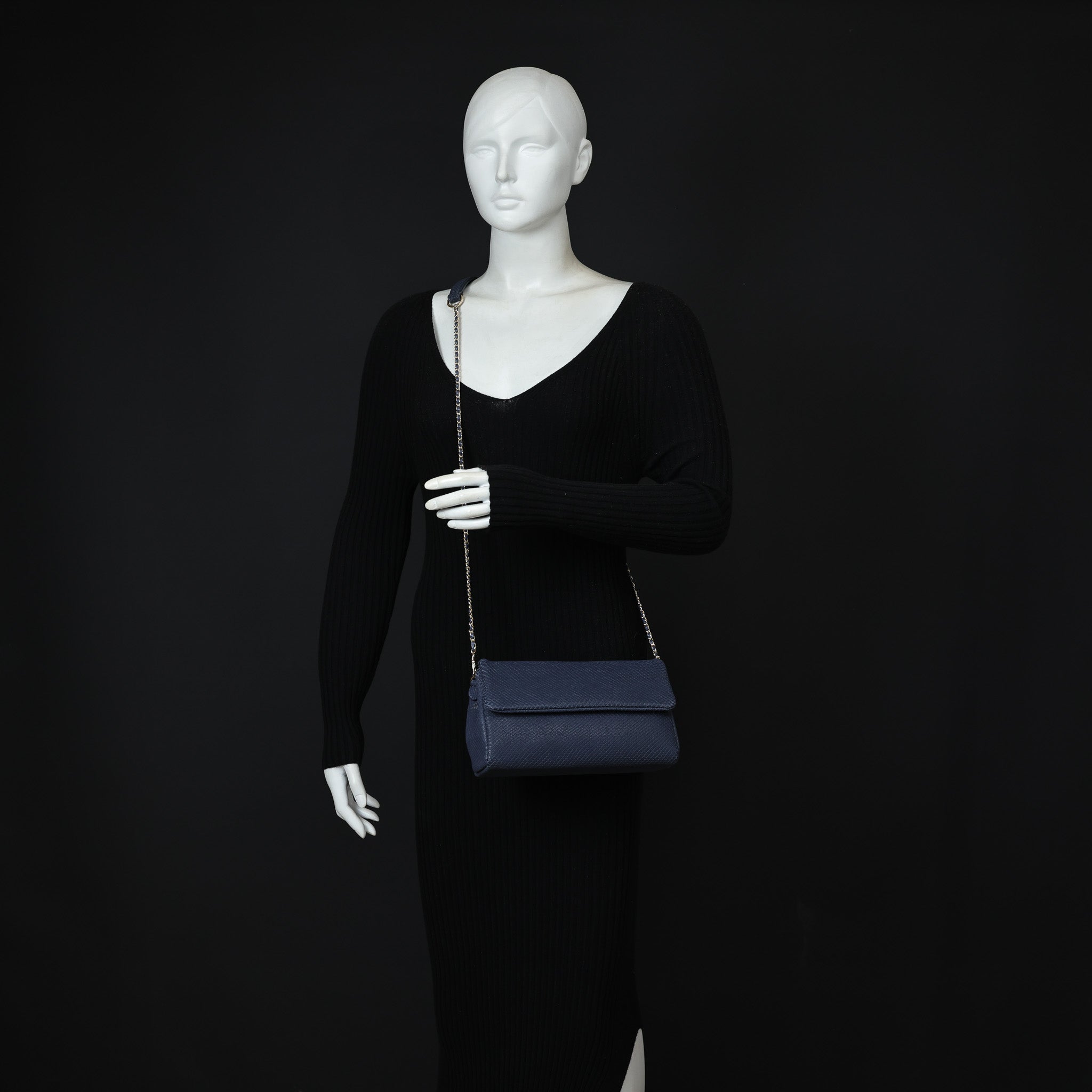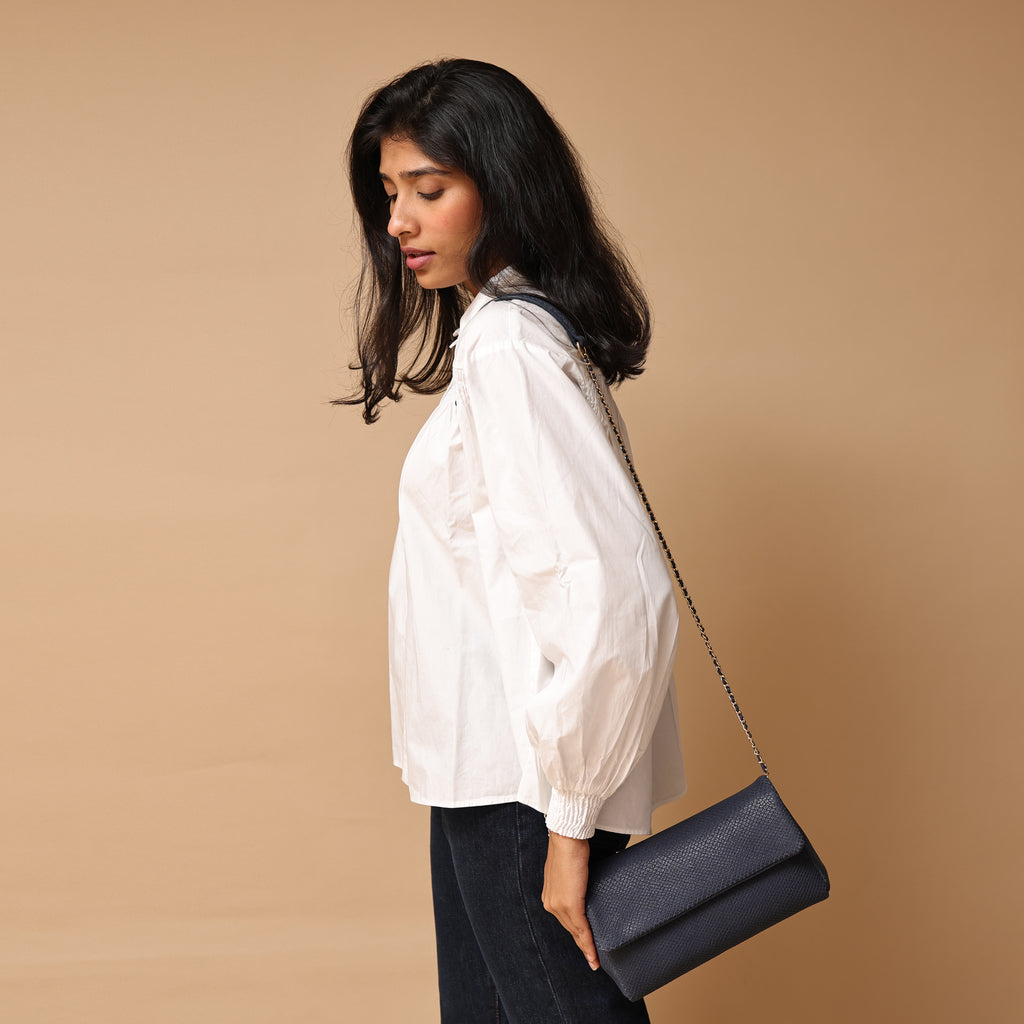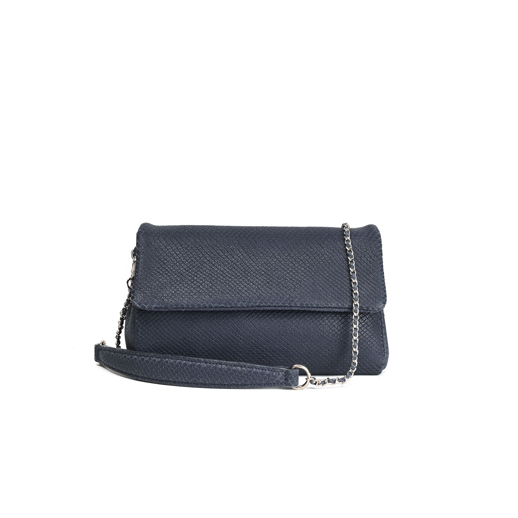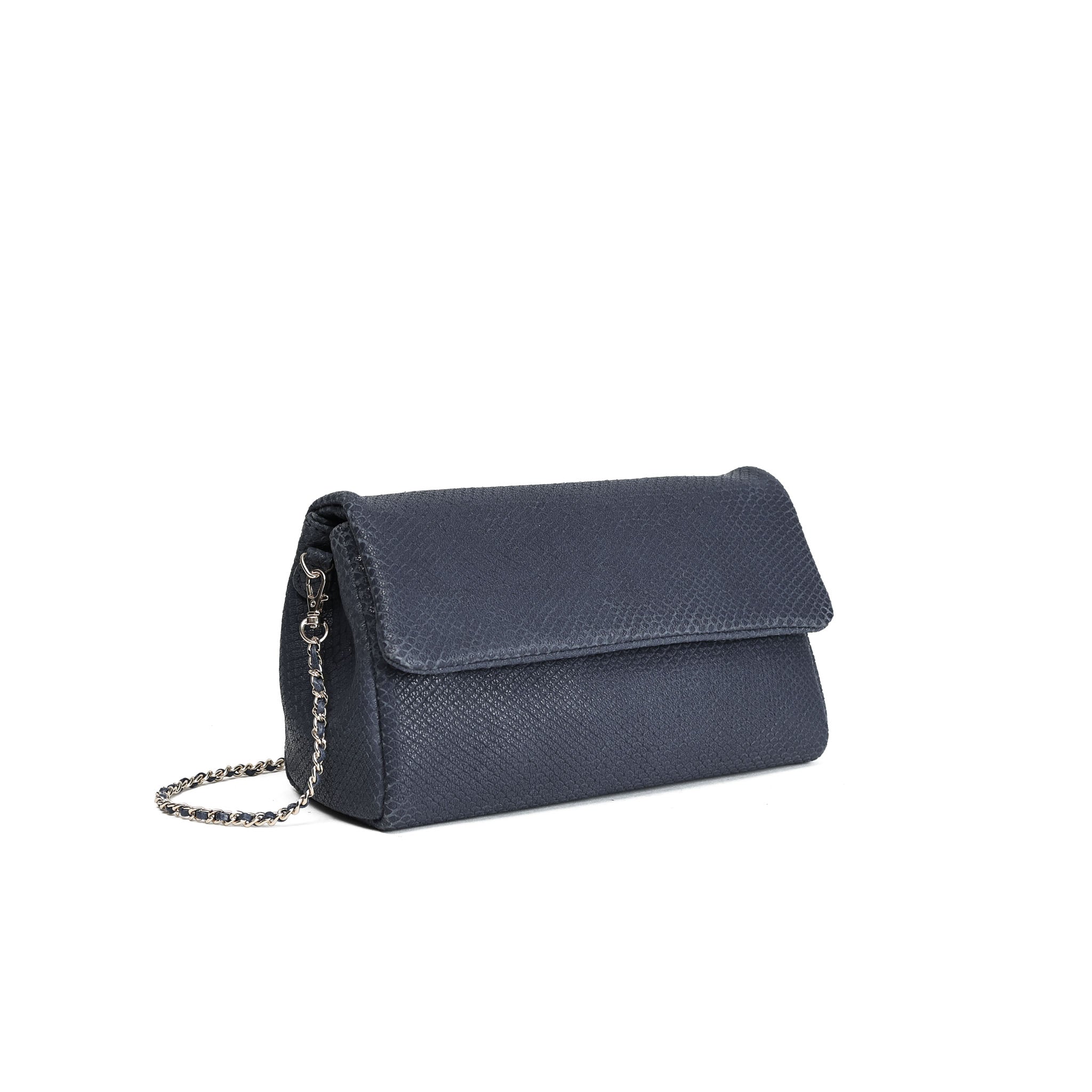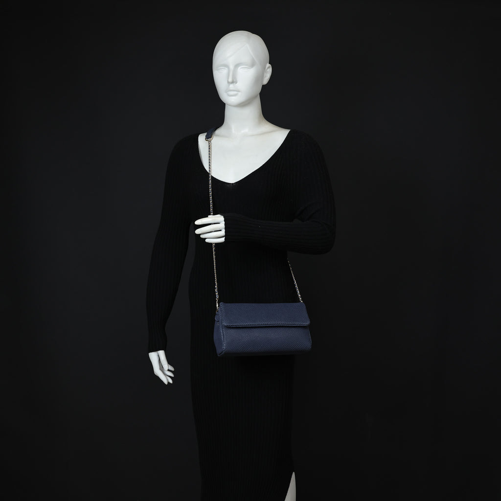 This stunning interlaced crossbody in an embossed fish scale printed leather, renders absolute style. It is the perfect day-to-night accessory