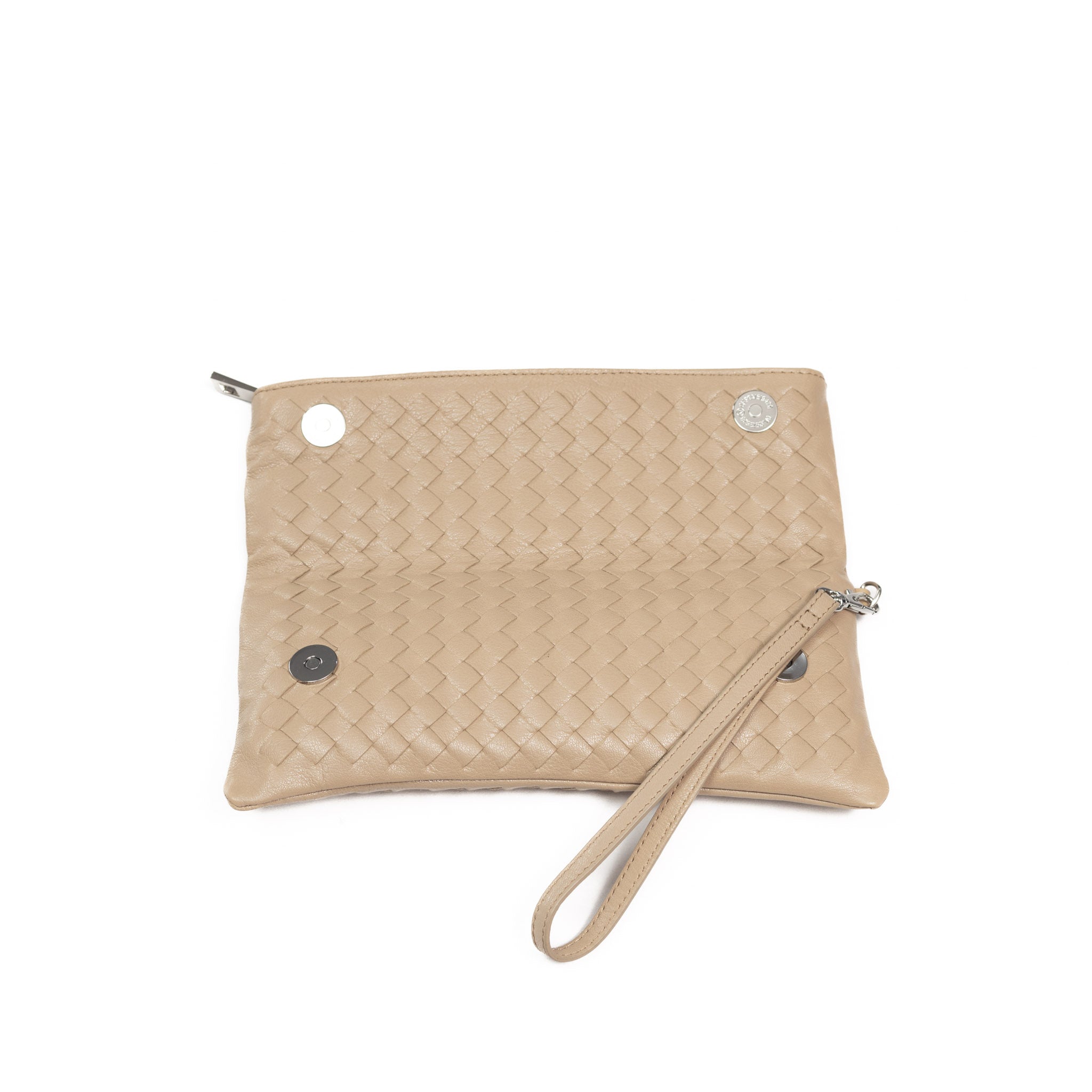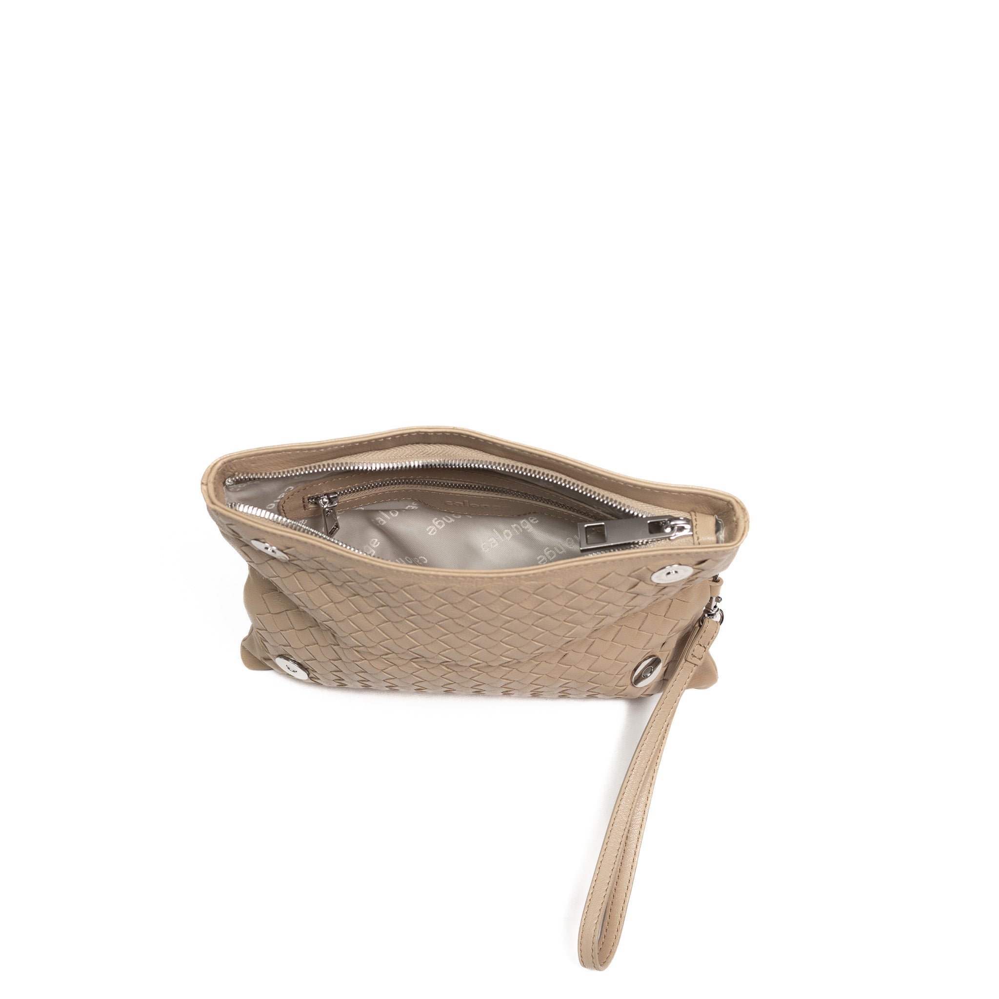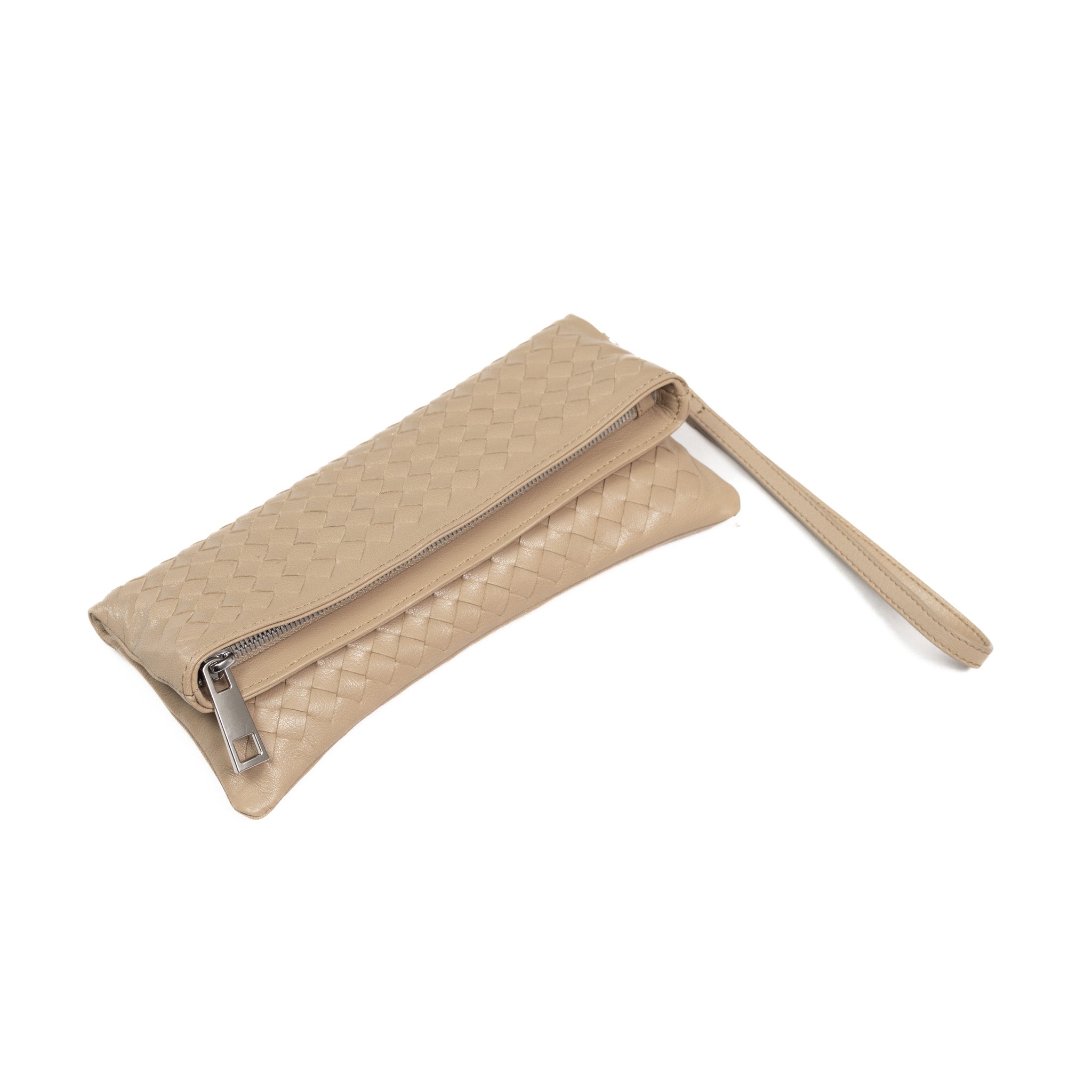 This foldover pouch is easy to carry, responding to today's need for effortless yet sophisticated accessories. It can be worn as a clutch or a wristlet