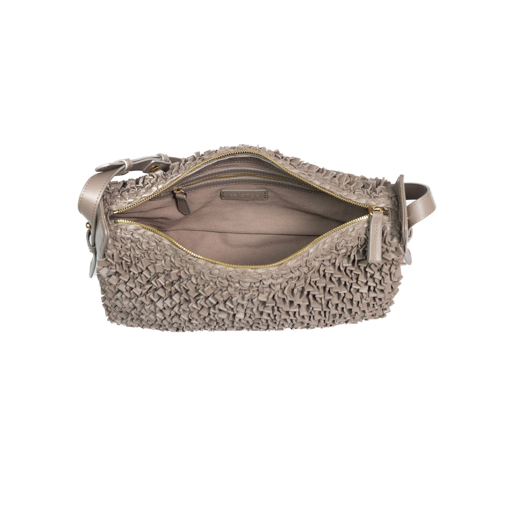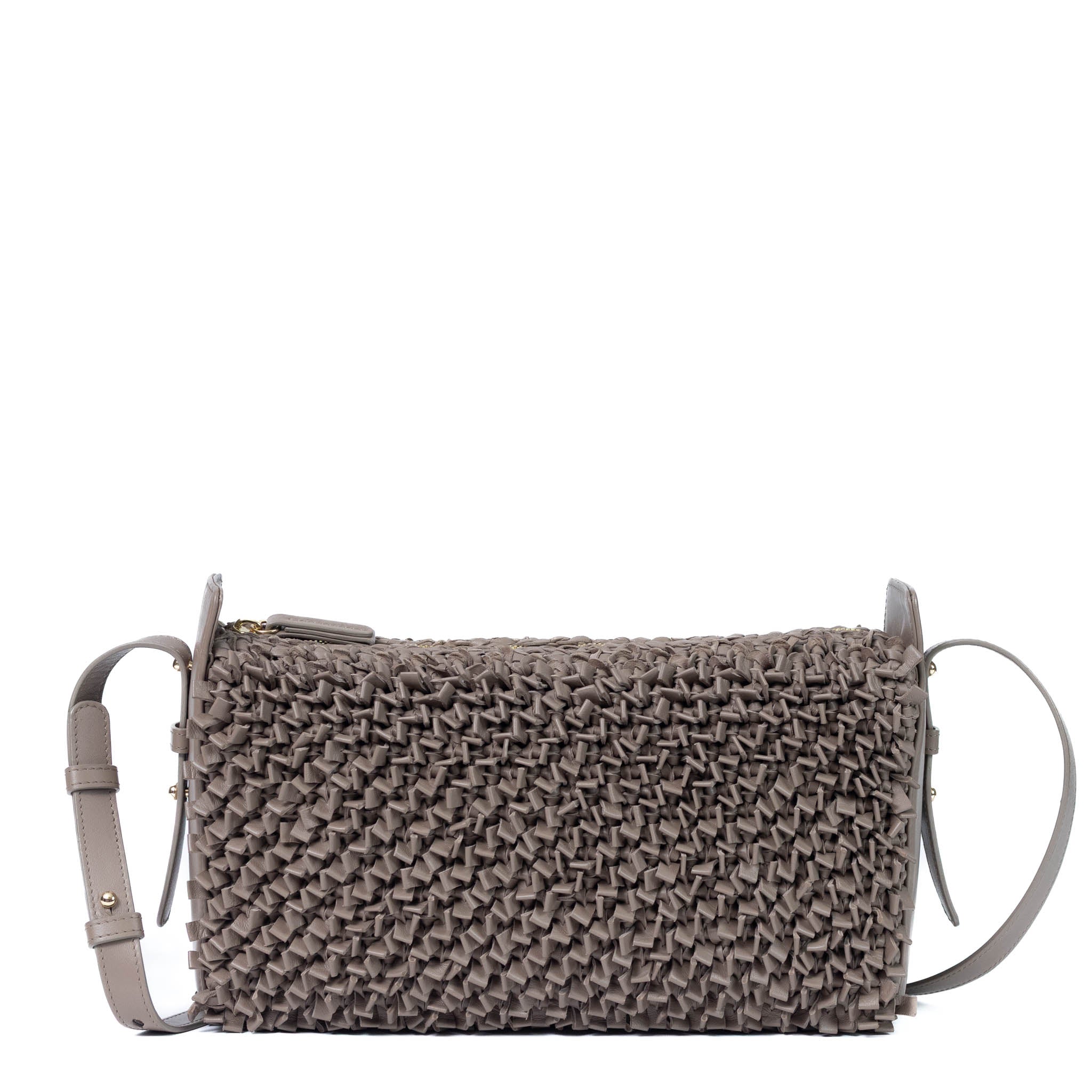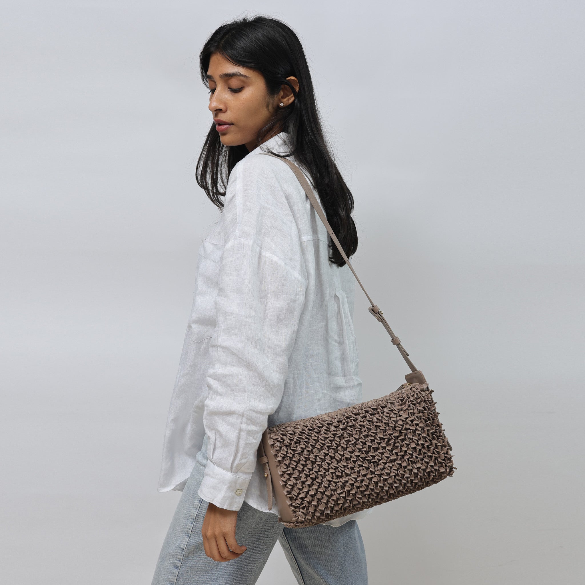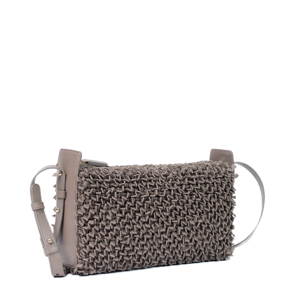 This is a chic and contemporary sling bag designed with a unique textured leather panel at the front, giving it a modern, artisanal appeal. The body of the bag is crafted in smooth leather, complemented by the intricate 3D leather detailing that adds depth and style.
